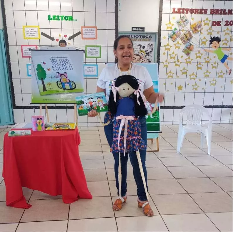 Ambos são inspirados na minha filha. O livro “A Menina de Rodinha Vai para a Escola”, escrito por Andreliana Lopes, fala um pouco da vida escolar. Já ouvi do diretor que a escola não estava preparada para recebê-la. Ouvi de uma funcionária da prefeitura que as mães querem se ver “livres” dos filhos e querem colocá-los na escola, e que essa criança não tem condições de ir para a escola. Mas ela foi, e foi muito bem recebida.